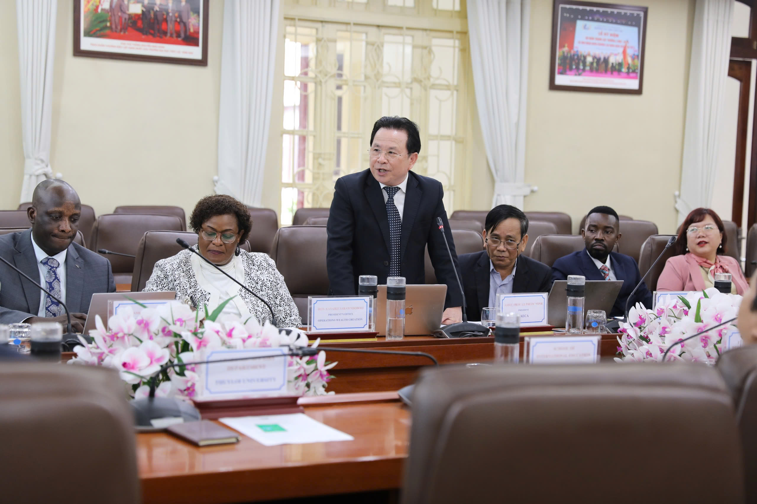 Phát biểu tại buổi làm việc, GS.TS. Trịnh Minh Thụ – Hiệu trưởng Nhà trường đã gửi lời cảm ơn tới phía Bạn đã dành thời gian tới thăm và làm việc cùng Trường ĐHTL và bày tỏ niềm vui khi hai bên có cơ hội ký kết MOU để mở rộng, tăng cường hợp tác đào tạo, nghiên cứu giữa các Trường. Bên cạnh đó, Hiệu trưởng Nhà trường cũng giới thiệu tới phía Bạn về các chương trình liên kết, hợp tác đào tạo, nghiên cứu đã có với các Trường Đại học và Doanh nghiệp trên thế giới và hy vọng rằng có thể xây dựng và mở rộng hợp tác hơn nữa với các Trường Đại học tại Uganda.