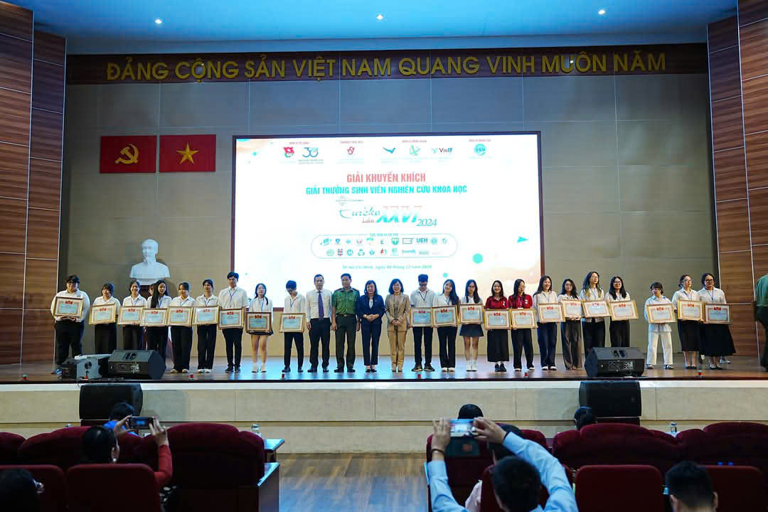 Ban tổ chức vinh danh và trao giải Khuyến khích cho đội (SV thứ 8,9 mặc áo đỏ từ phải sang)