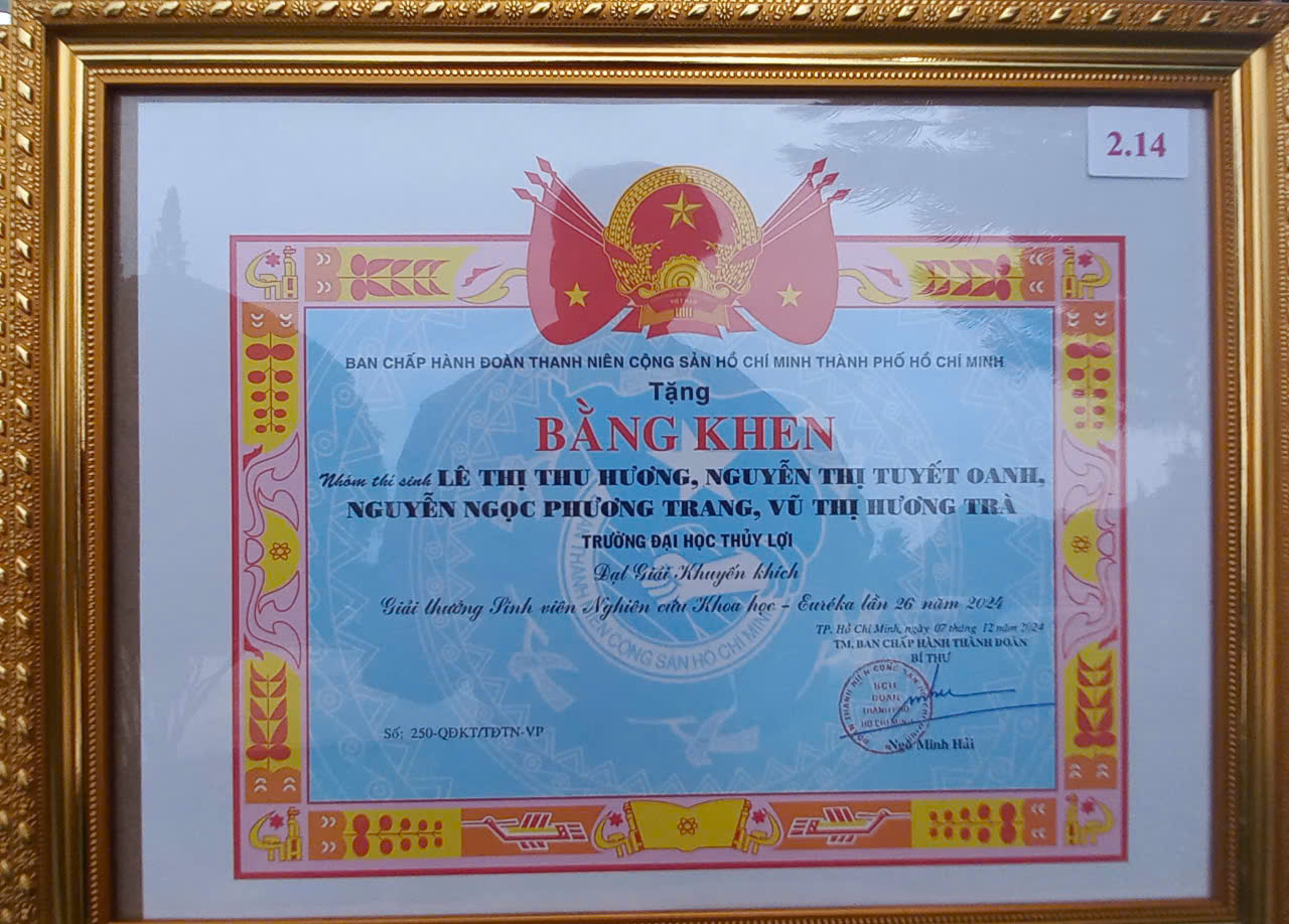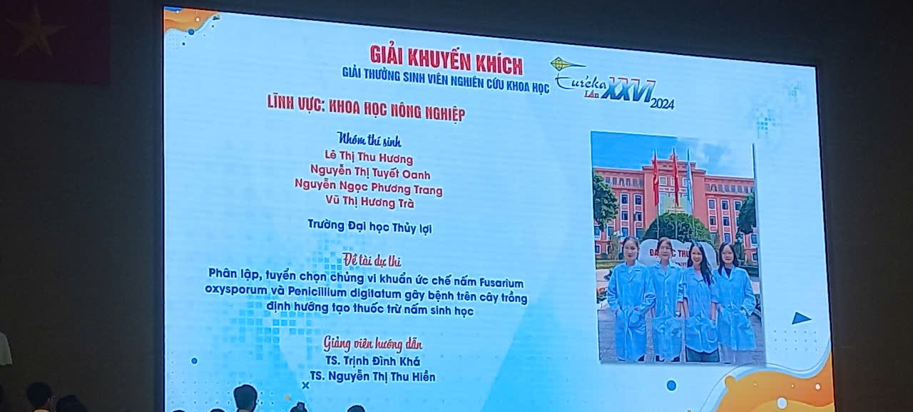 Kết quả chung cuộc, nhóm tác giả Trường Đại học Thuỷ lợi gồm 4 sinh viên: Lê Thị Thu Hương, Nguyễn Thị Tuyết Oanh, Nguyễn Ngọc Phương Trang, Vũ Thị Hương Trà – sinh viên ngành Công nghệ sinh học – Khoa Hoá và Môi trường đoạt giải Khuyến khích với đề tài “Phân lập, tuyển chọn chủng vi khuẩn ức chế nấm Fusarium oxysporum và Penicillium digitatum gây bệnh trên cây trồng, định hướng tạo thuốc trừ nấm sinh học”. Đề tài này do giảng viên TS. Trịnh Đình Khá và TS. Nguyễn Thị Thu Hiền hướng dẫn. Đề tài được hội đồng khoa học gồm các chuyên gia đầu ngành trong lĩnh vực khoa học nông nghiệp đánh giá cao về ý nghĩa khoa học, thực tiễn và khả năng ứng dụng vào thực tiễn phòng trừ nấm gây bệnh trên cây trồng trong nền nông nghiệp hữu cơ.