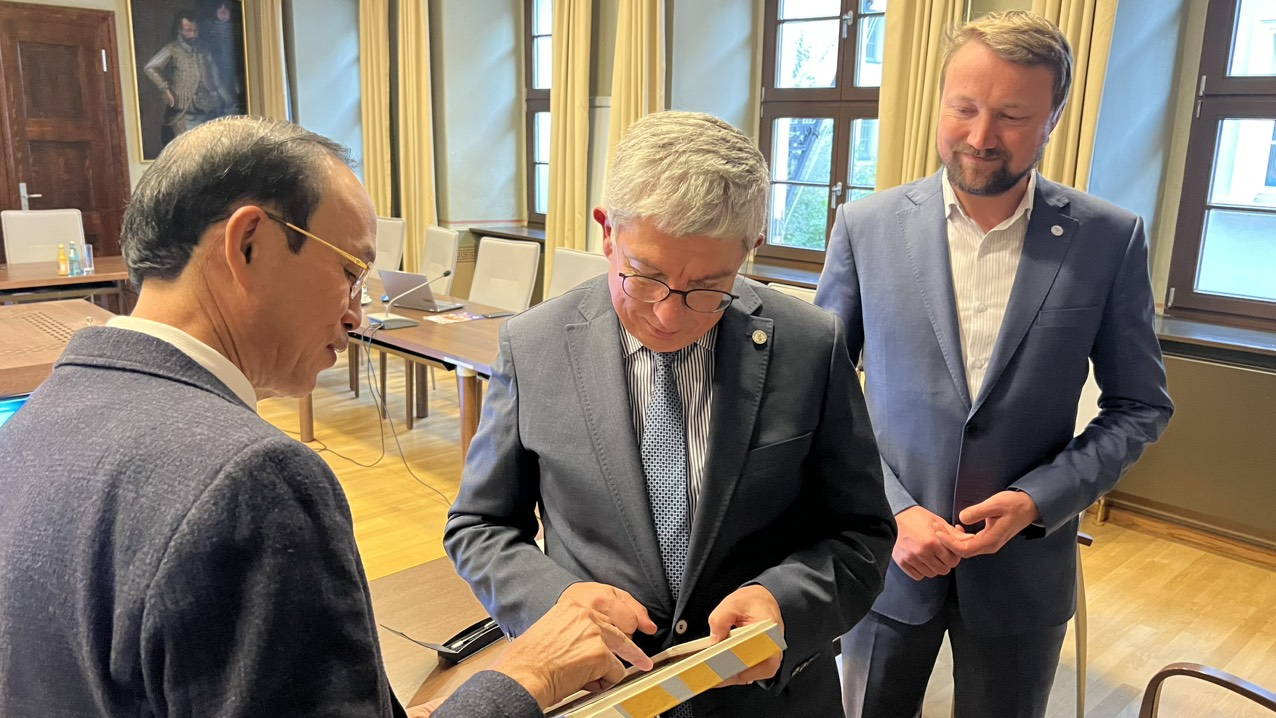 Tiếp Đoàn công tác, về phía trường TU Freiberg có GS.TS Klaus Dieter Barbknecht, Hiệu trưởng Nhà trường; Bà Ingrid Lange, Giám đốc Văn phòng hợp tác quốc tế và GS.TS Henning Zeidler, Phó trưởng khoa Kỹ thuật cơ khí và năng lượng, điều phối viên chương trình hợp tác với Trường Đại học Thủy lợi.