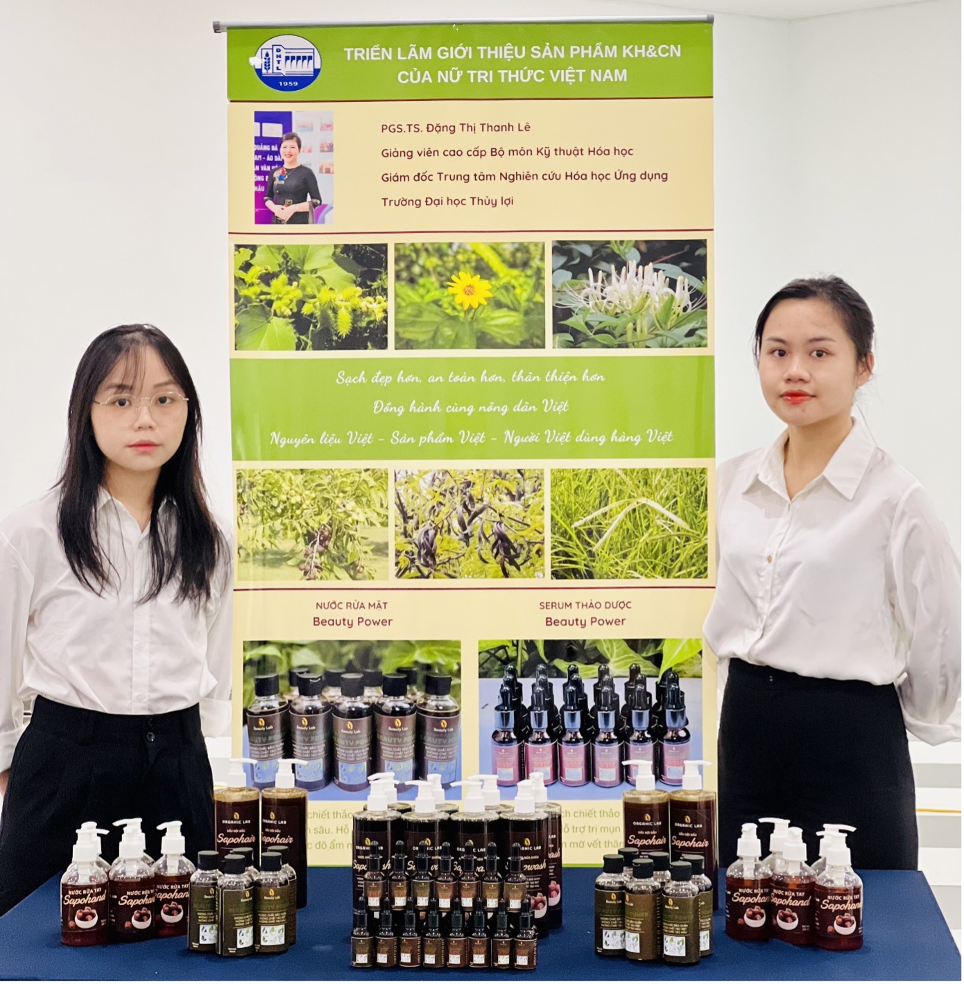 PGS.TS Đặng Thị Thanh Lê và nhóm nữ sinh viên ngành Kỹ thuật Hóa học, Trường Đại học Thủy lợi đã mang đến triển lãm các sản phẩm chăm sóc sức khỏe gia đình và chăm sóc sắc đẹp. Dòng sản phẩm chăm sóc sức khỏe gia đình Sapofamily bao gồm Nước rửa chén Sapowash, Nước rửa tay Sapohand và Dầu gội đầu Sapohair. Các sản phẩm này là kết quả của các đề tài nghiên cứu khoa học và dự án khởi nghiệp và đổi mới sáng tạo của sinh viên ngành Kỹ thuật Hóa học từ năm 2019 đến nay. Trong đó sản phẩm Nước rửa chén Sapowash đã đạt giải Ba toàn quốc cuộc thi Học sinh, Sinh viên với ý tưởng khởi nghiệp SV-STARTUP 2020. Dòng sản phẩm Sapofamily đã được cục Sở hữu Trí tuệ bảo hộ và đã được thương mại hóa, người tiêu dùng phản hồi tốt về chất lượng sản phẩm. Dòng sản phẩm chăm sóc sức khỏe và sắc đẹp bao gồm Serum thảo dược Beauty Power và Nước rửa mặt thảo dược Beauty Power. Các sản phẩm này đang thử nghiệm tại Khoa Da liễu, Bệnh Viện Tuệ Tĩnh. Trong tương lai, nhóm nghiên cứu sẽ phát triển thêm các sản phẩm khác như Kem thảo dược trị nám Beauty Power, Serum thảo dược trị nám Beauty Power.