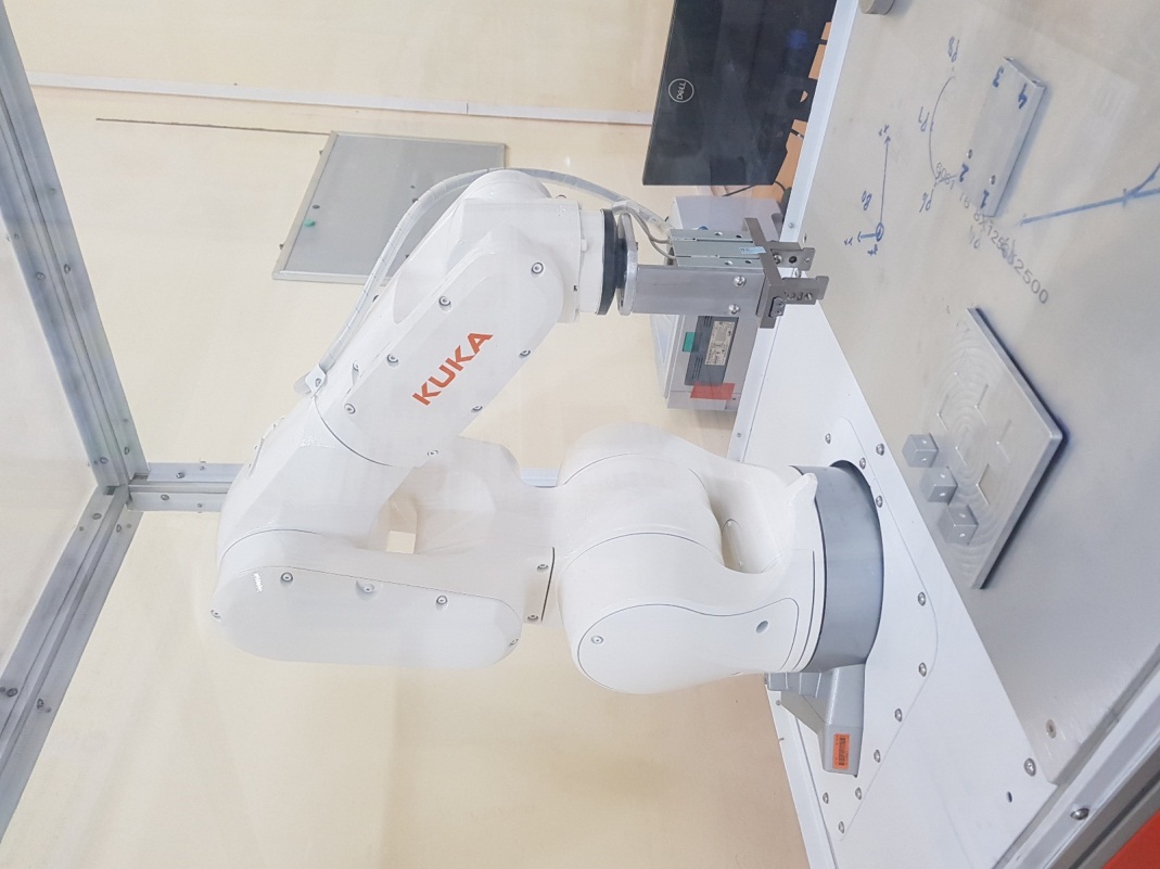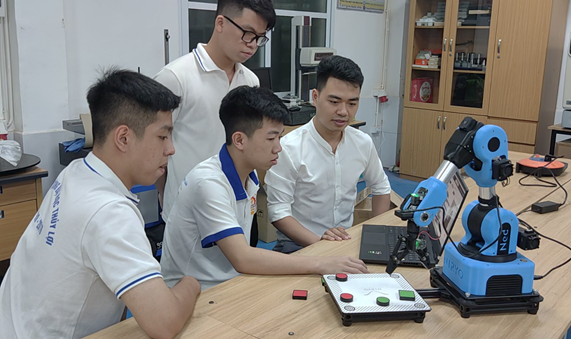 Sinh viên được hướng dẫn vận hành robot KUKA KR 6 – R700 kết hợp với dây chuyền lắp ráp động cơ điều khiển bằng PLC – PTN Kỹ thuật Cơ điện tử