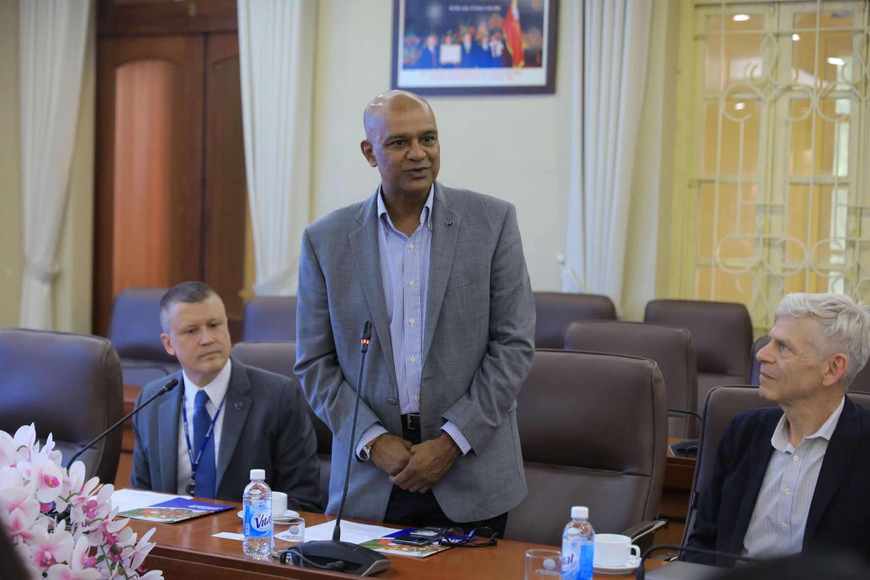 Phát biểu tại cuộc họp, GS.TS. Rohit Verma – Hiệu trưởng ĐH VinUni bày tỏ sự cảm ơn sâu sắc trước buổi tiếp đón nhiệt tình, chu đáo của Nhà trường cũng như bài trình bày ấn tượng với đầy đủ thông tin, các chủ đề nóng, cập nhật, phù hợp với tiêu chí hợp tác của trường. GS. Verma mong muốn được thúc đẩy hợp tác trước tiên là cấp khoa với các nội dung cụ thể như: trao đổi giảng viên, sinh viên; đồng tổ chức các buổi hội thảo, chuyên đề từ đó đưa ra các nghiên cứu chung để cùng thực hiện; trao đổi tài liệu, học thuật, các báo cáo,nghiên cứu. ĐH VinUni sẽ cấp học bổng cho các sinh viên xuất sắc của ĐHTL có nguyện vọng theo học sau đại học tại ĐH VinUni.